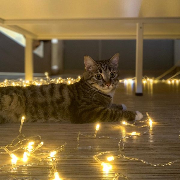 Это мой первый Новый год. Я еще ни разу не роняла елку, не перегрызала гирлянду и не давилась дождиком. Хотя стремление есть. Я очень любопытна, игрива и интересуюсь всем новым.