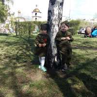 На фотографии брат Ваня (3,5 года) и сестра Вероника (2 года). Мы сшили им к Дню Победы военные костюмы, разучили стихи и песни. Ваня и Вероника поздравили ветеранов, поблагодарили их за счастливое детство под мирным небом.
