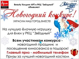Beauty-холдинг «АРТ» и развлекательный центр «Звездный» объявляют новогодний конкурс на лучшую елочную игрушку. Игрушки принимаются до 23 декабря по адресу: ул. Декабрьских Событий, 102 (академия «АРТ»).