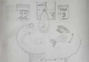 Бег времени. Рисунок разделён на два времени, где показано начало события, 22 июня, и 9 мая — День Победы.