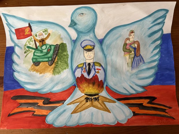 Я — Марианна, мне 9 лет. Ко Дню Великой Победы мне захотелось выразить на рисунке и Победу, и Мир, и то, что Победа была за нами, а также символику Вечного огня, потому что ничто не забыто и никто не забыт, помним всегда наших ветеранов! Поэтому пришла в голову идея нарисовать именно такую работу.