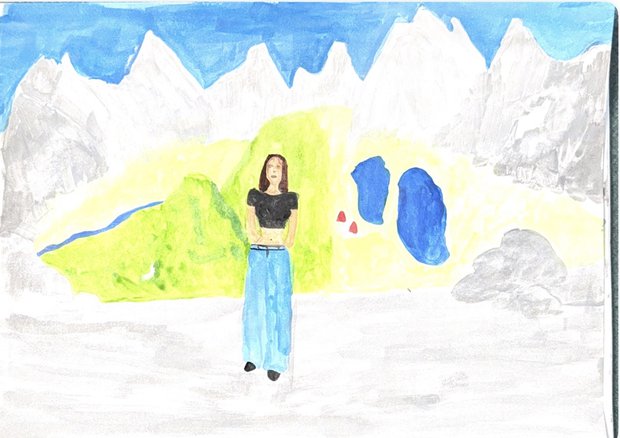 Этим летом я ходила в поход на Шумак. Там очень красиво, на рисунке я на Шумакском перевале, позади меня 2 озера, рядом с ними лагерь, с другой стороны течет ручей.