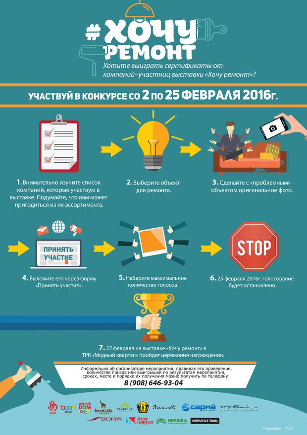 Хотите сделать ремонт? Выбираете новую кухню или качественную мебель по выгодной цене, мечтаете о натяжном потолке и новой люстре, вам нужны новые шторы, ищите подходящую дверь или хотите нанять профессиональную ремонтную бригаду. Тогда обязательно приходите 27 февраля 2016 года в 15:00 в ТРК «Модный квартал» на интерактивную выставку «Хочу ремонт». Вас ждут выгодные предложения от компаний, конкурсы, акции и подарки.