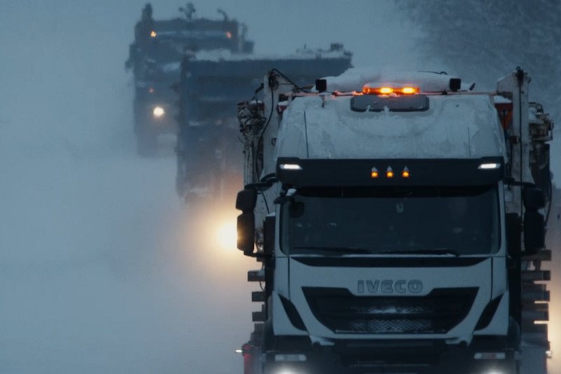 Большегрузы на зимней трассе. Кадр из фильма «Зимник» Юрия Дорохина