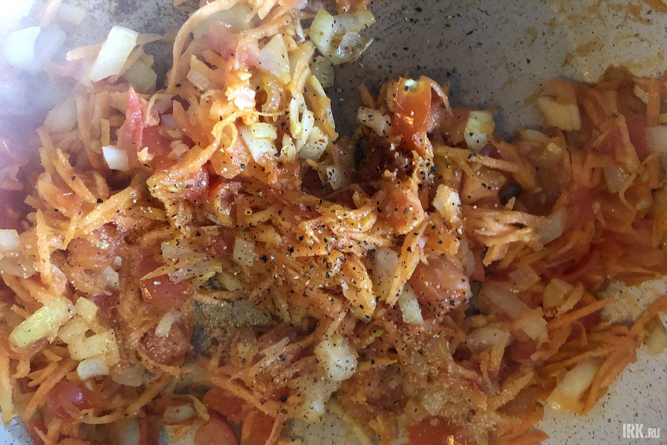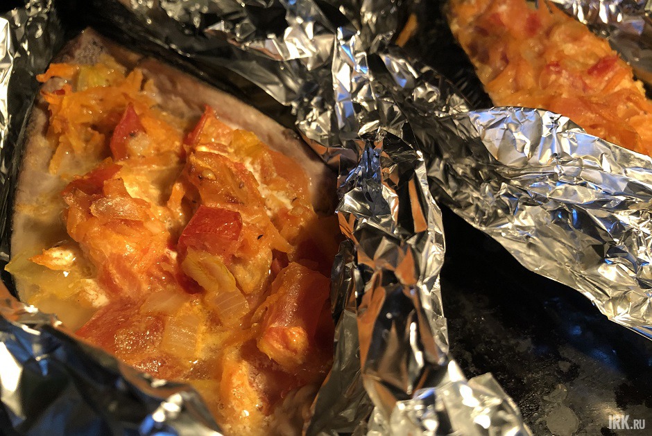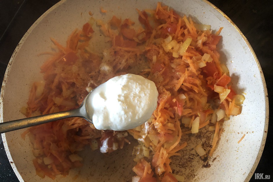 Начинка. Морковь – на терке, помидоры и лук – помельче. На сковороде с ложкой оливкового масла обжарим 5 минут, добавим сметану, специи, перемешаем, снимем с огня. Начиним скумбрию овощами. По желанию можно рыбу присолить внутри. Я чуть смазала рыбным соусом. Делаем из двойного листа фольги «лодочки» для рыбы.