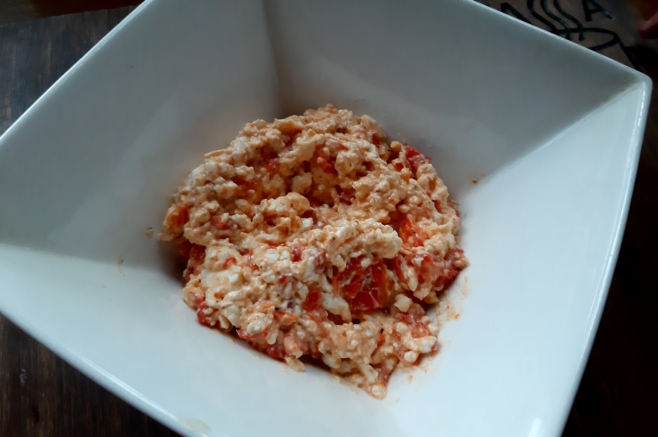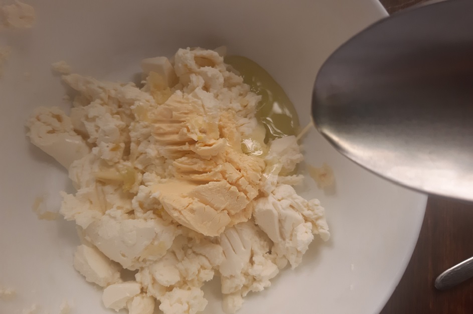 Чеснок пропустим через пресс, разомнем фету вилкой, объединим с чесноком. Добавим перец, специи, масло, сметану и соль. Перемешаем, готово.