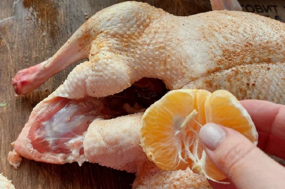 Если честно, мне эти утки-гуси никогда особо не нравились и так себе удавались. Но все, что про мясо и фрукты, для меня привлекательно. Попробовала приготовить птицу по этому рецепту, теперь смело могу вам рекомендовать. На месте утки может быть гусь, индейка, и даже курица будет смотреться нарядно – карамельно-цитрусовое снаружи и мандариновое внутри сделают свое дело. Плюс один несложный лайфхак, после которого можно не переживать за горячее в новогоднюю ночь. Приступим.