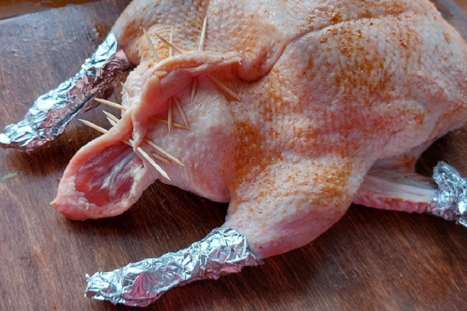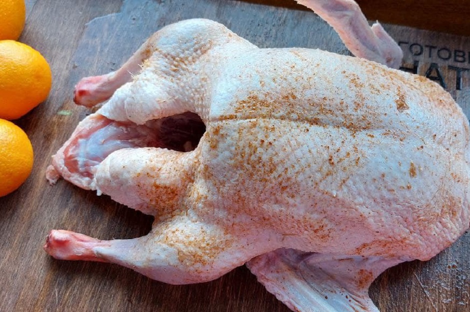 Как подойдет время, достанем птицу, высушим бумажными полотенцами, натрем снаружи и внутри любимыми специями. Я нашла готовую для утки с неплохим составом: паприка, имбирь, лавровый лист, белый перец, корица, розмарин, куркума. Если не найдете – корицы, перца и имбиря будет достаточно.