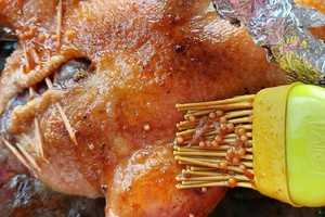 Через час после начала выпекания достаем птицу, смазываем карамелью, ставим еще на 20 минут. И снова повторим: смажем карамелью и поставим на 20 минут. Готово.