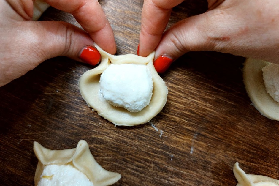 В центр каждого круга кладем начинку размером с грецкий орех. И защипываем края так, чтобы получилась звезда. Или солнце. Или звезда по имени Солнце. В общем, как на фото.