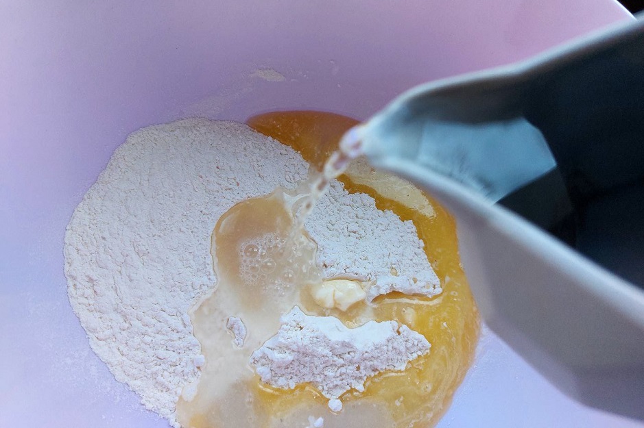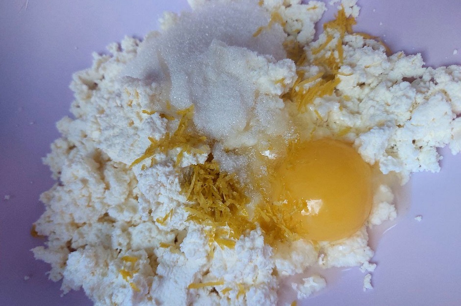 Творог (рикотту) смешаем с сахаром, яйцом, 50 граммами муки и разрыхлителем. Добавим цедру лимона, все перемешаем.