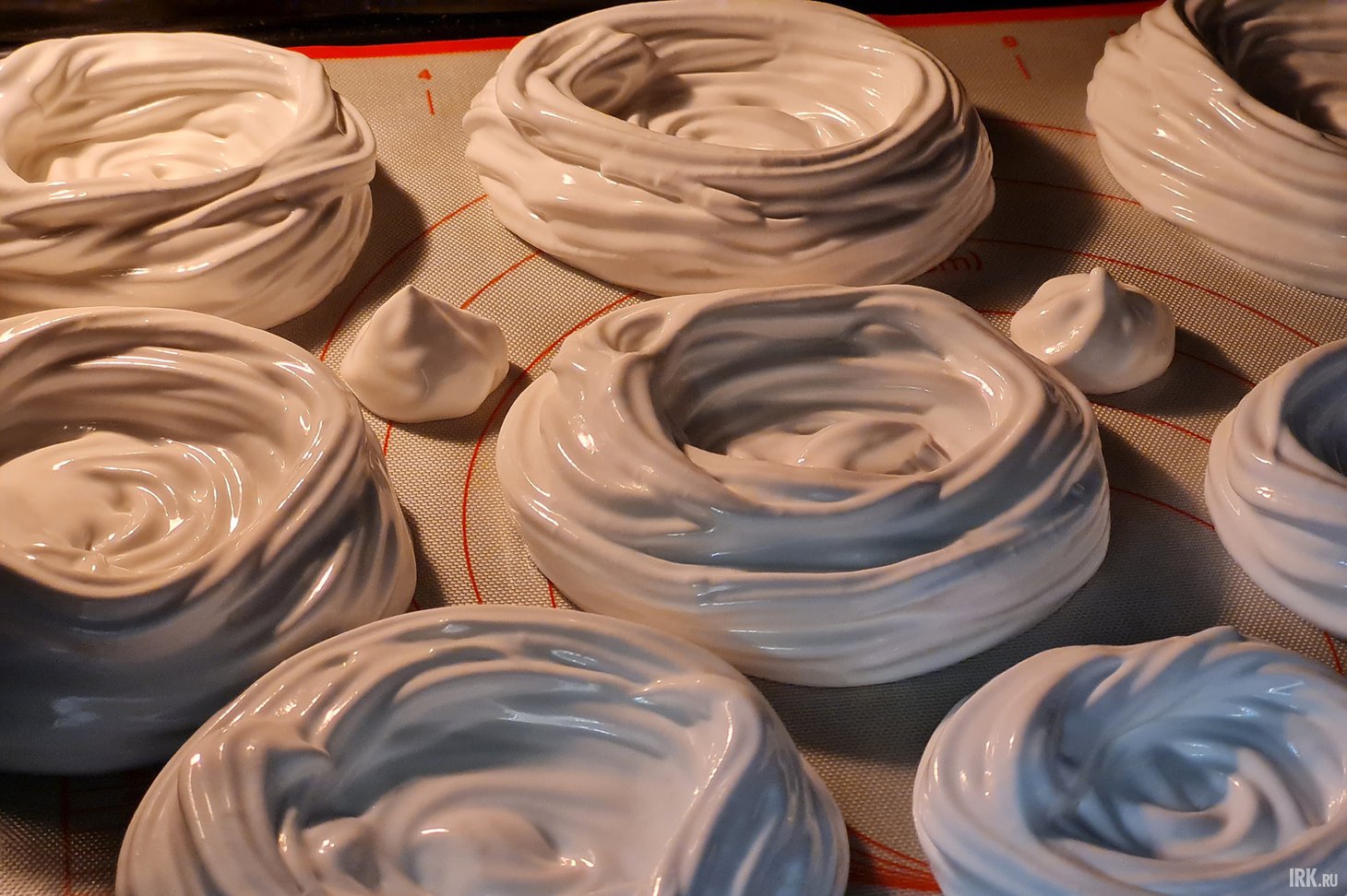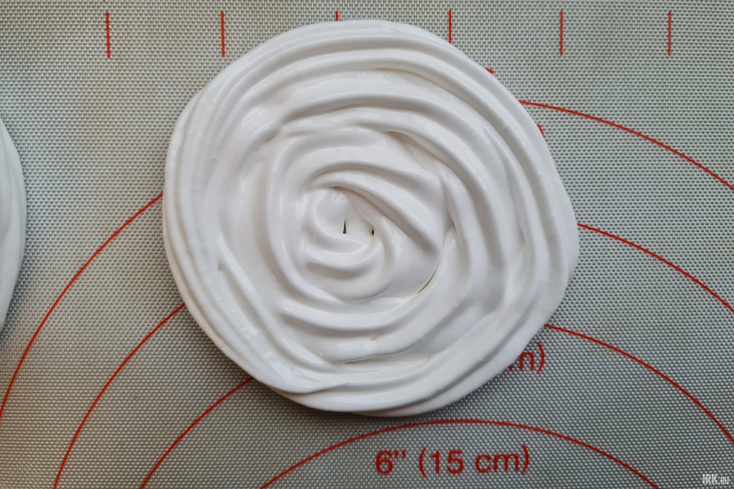 Духовку включите на 100 градусов, чтобы прогрелась. Противень застелите пергаментом (лучше силиконизированным) или кондитерским ковриком. Взбитый белок выложите в кондитерский мешок и отсадите по кругу на противень донышки корзиночек. Диаметр корзиночек примерно 10 сантиметров. У меня получается 8 штук.