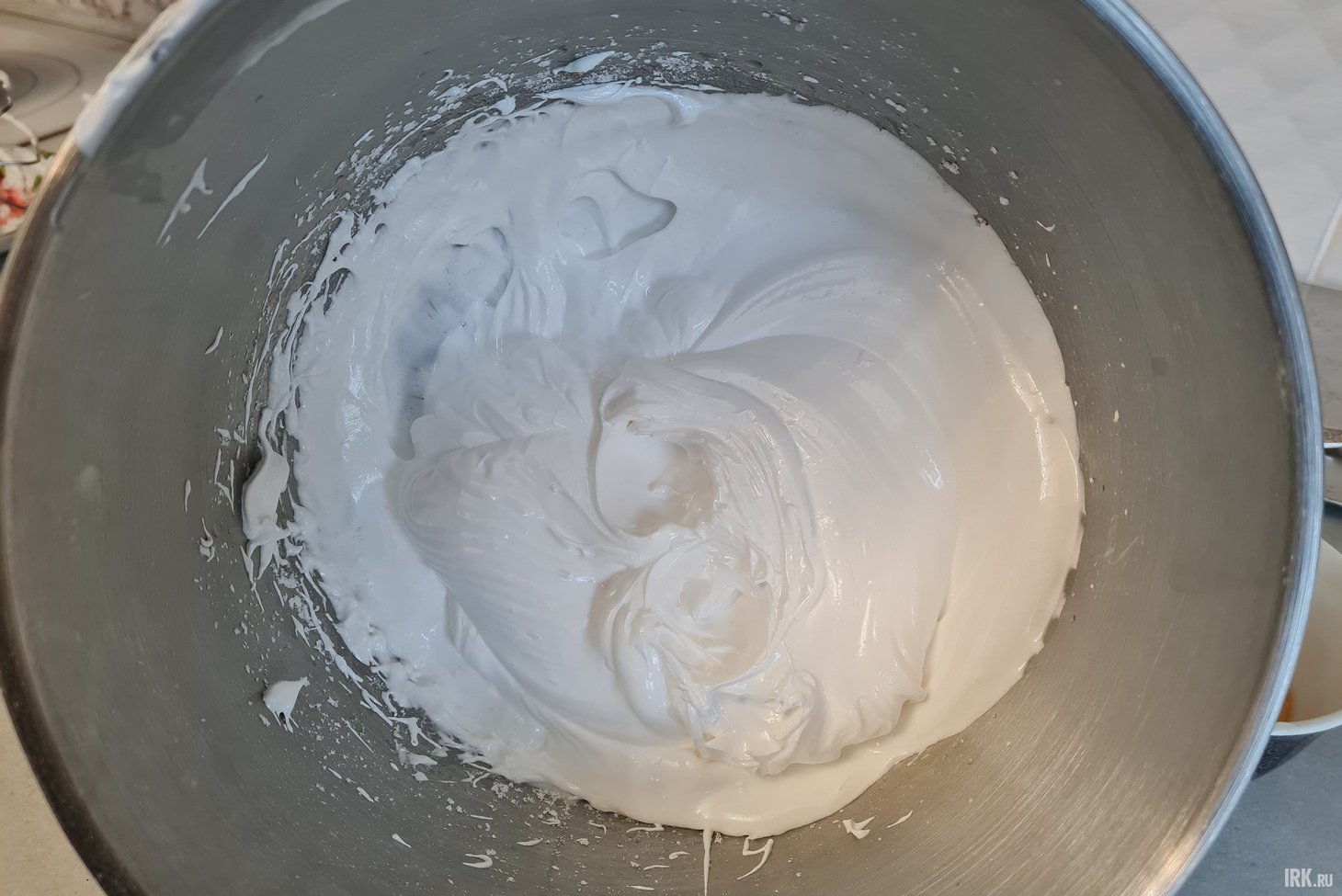 Миска, где будете взбивать белки, должна быть глубокой со сферическим дном. Если такой нет, просто слегка наклоняйте при взбивании посуду с белками. Взбейте белки до состояния пены, как на видео.