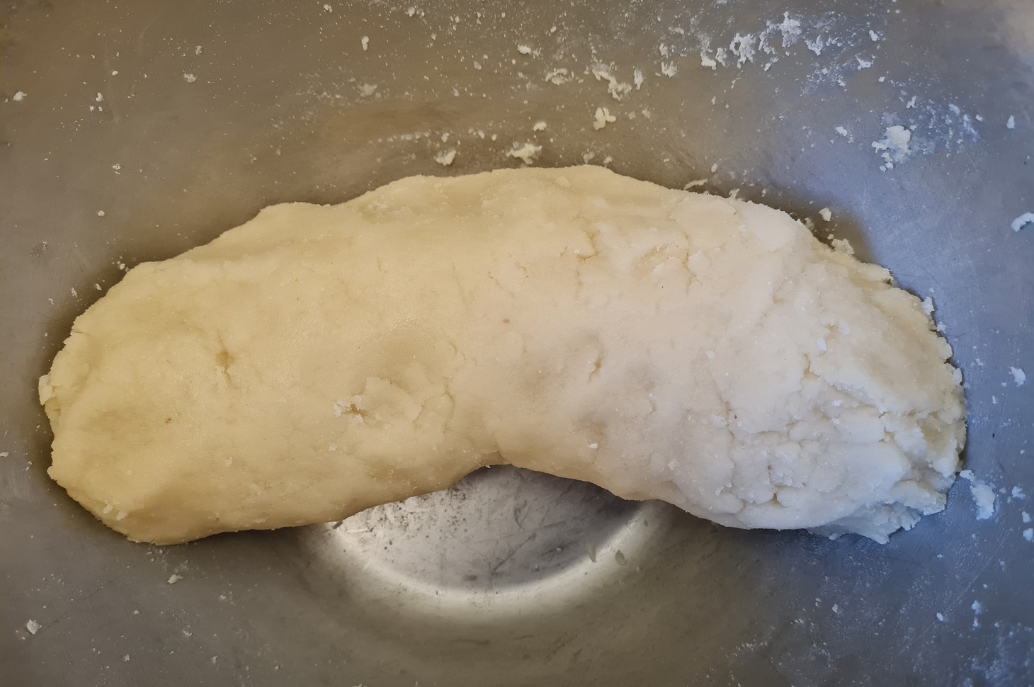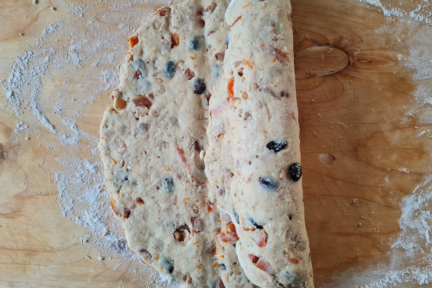 Каждую по очереди раскатайте толщиной два сантиметра. Зрительно разделите круг на три части и ребром ладони сделайте углубленную линию, отделяя третью часть слева. Положите марципан. Теперь рукой заверните правую часть до этой линии. А сверху заложите левую часть — получилось подобие спелёнутого младенца. Штоллен символизирует рождение Христа.