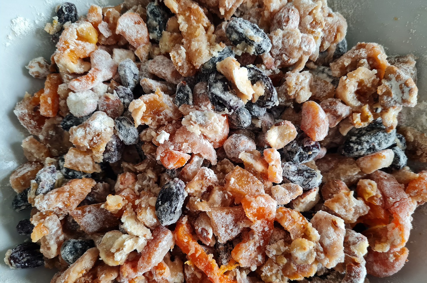Сначала сверху перемешайте сухие ингредиенты, а потом замесите тесто. Сложите подготовленные орехи, цукаты, сухофрукты в одну миску, сверху просейте 80 граммов муки и перемешайте.