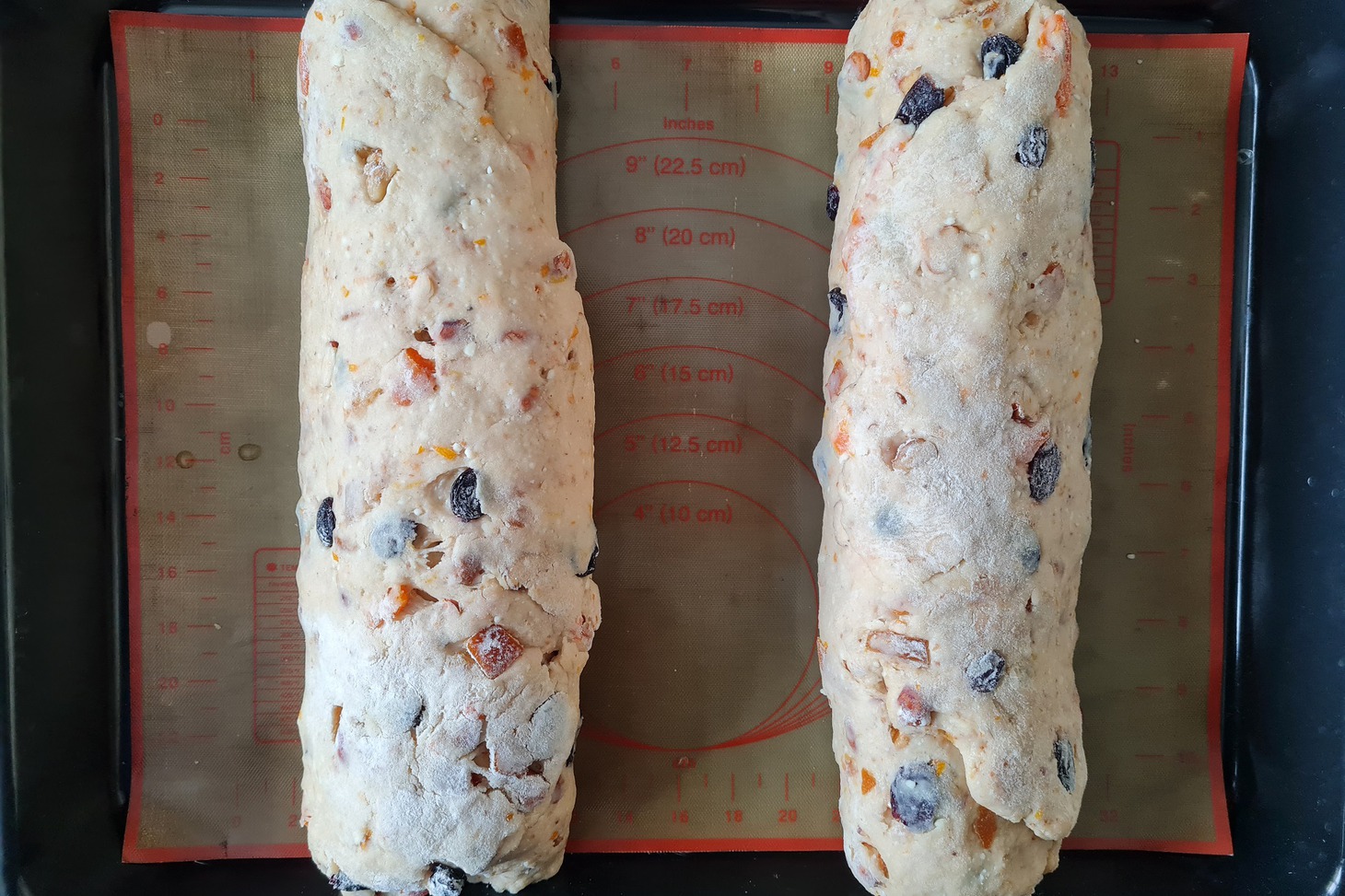 Подготовленные штоллены переложите на противень, смазанный растительным маслом или застеленный силиконовым ковриком. Выпекайте в течение часа, напоминаю, при 180 градусах. Если в конце выпечки начнут сильно зарумяниваться, прикройте фольгой.
