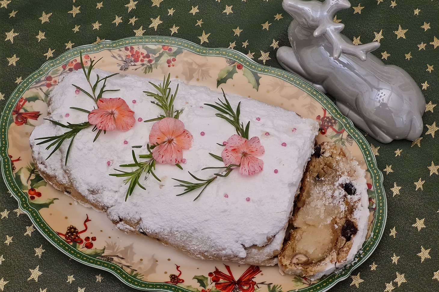 При подаче не забудьте украсить штоллен. У меня на фотографии — свежий розмарин и цветы пеларгонии. Сладкого вам Нового года и Рождества!