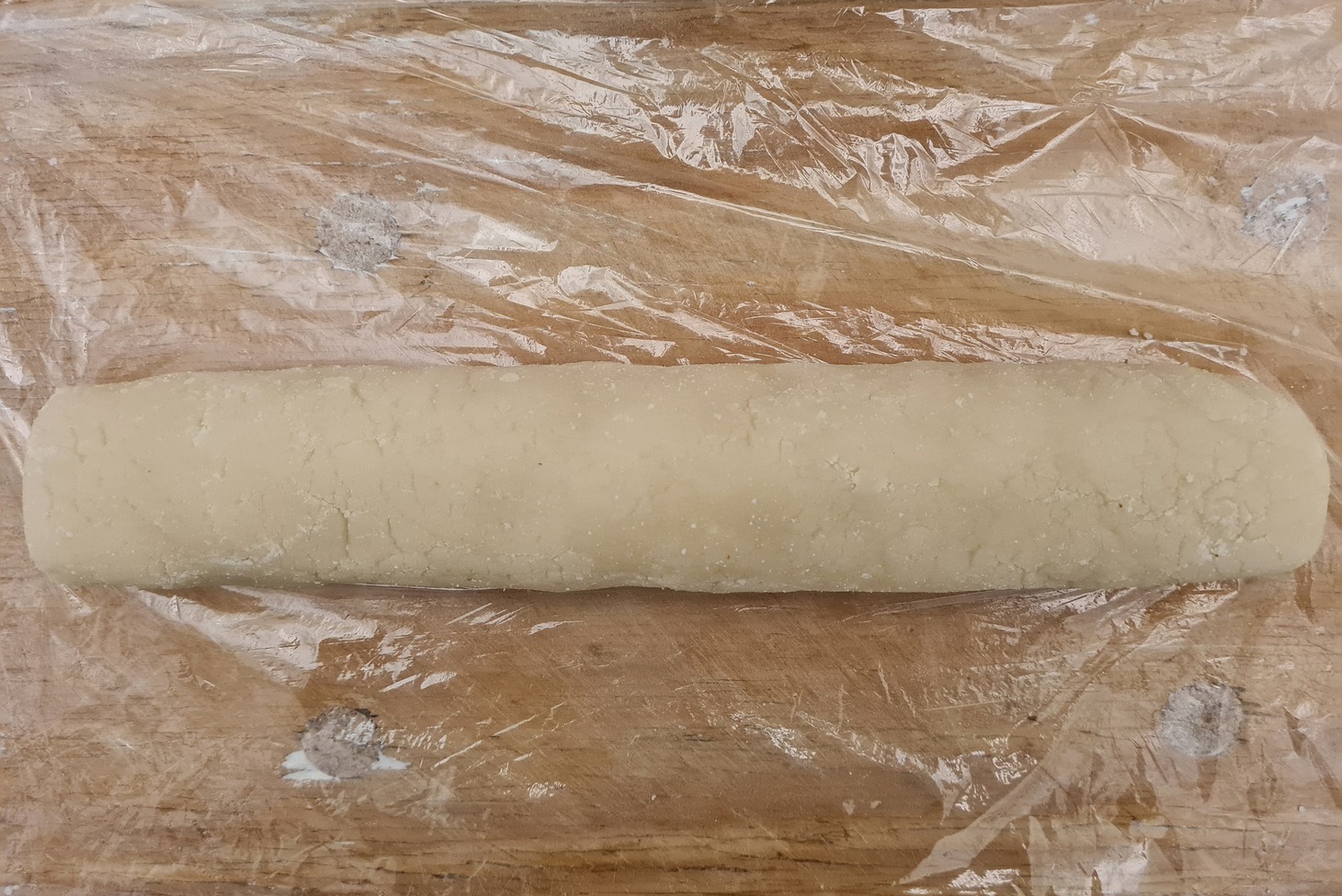 Разделите массу пополам и скатайте две марципановые колбаски. Длина их должна быть равна ширине противня. Заверните каждую в пищевую плёнку и уберите в холодильник на сутки для стабилизации.