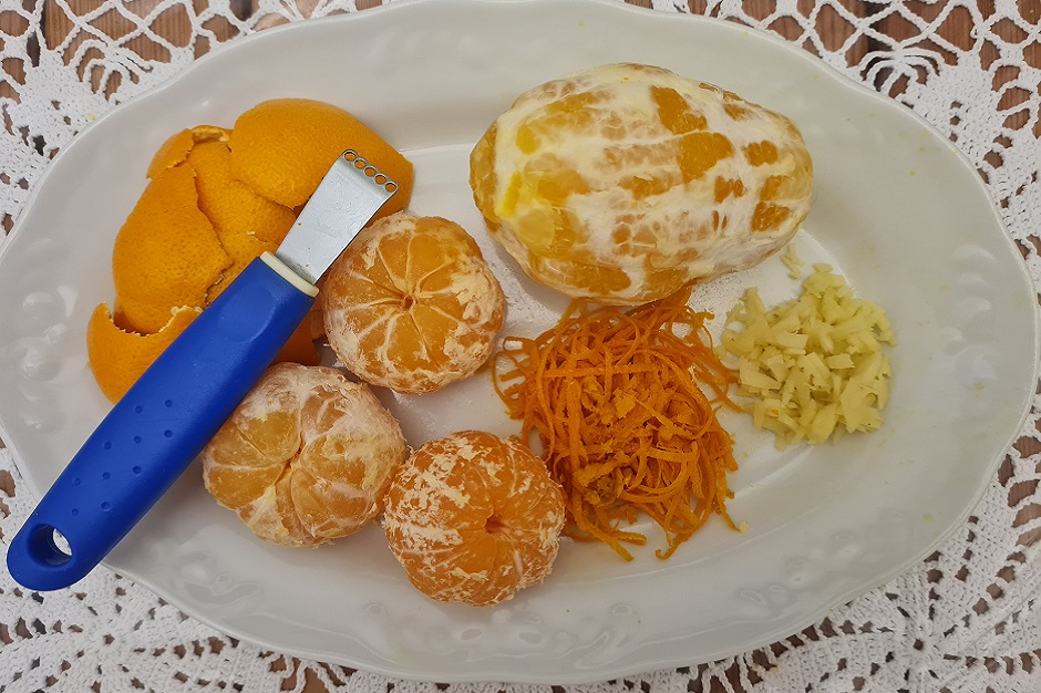 Фрукты промойте. С апельсина снимите цедру, затем удалите белую часть. Цедру удобно снимать специальным приспособлением. Показываю его на фото. Мандарины очистите. Кожуру не выбрасывайте. Имбирь тоже почистите и мелко нарежьте.