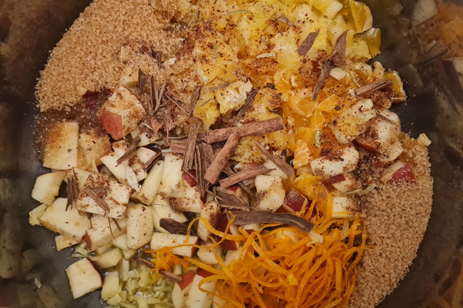 В кастрюлю из неокисляющегося материала выложите нарезанные яблоко и цитрусовые. Добавьте сахар, имбирь, специи. Мускатный орех у нас уже молотый. Палочку корицы разломайте на кусочки. Остальные специи немного истолките в ступке или с помощью кулинарного молотка.