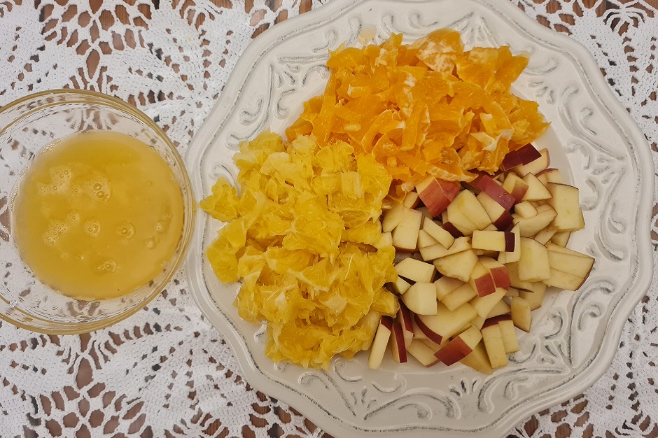 Мякоть апельсина нарежьте, слегка предварительно отжав сок в мисочку. Яблоко и мандарины нарежьте небольшими кусочками.